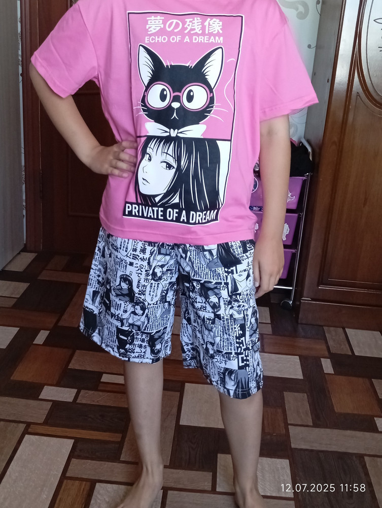Свободный крой футболки создаёт ощущение лёгкости и не стесняет движений, а стильный дизайн и современный силуэт позволяют использовать костюм как для дома, так и для прогулок, поездок или пляжа. Модель легко сочетается с другой одеждой, а её универсальный фасон и качество пошива делают комплект долговечным и практичным.